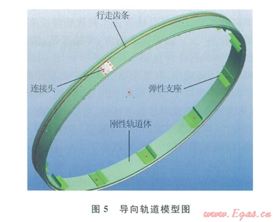 導(dǎo)向軌道采用分體式環(huán)形結(jié)構(gòu),軌道由2塊半圓弧軌道通過連接頭和鎖緊把手連接而成,其上設(shè)有齒條,以實現(xiàn)與齒輪的動力傳動(圖5)。