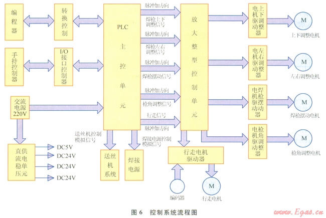 通過手持控制器可選擇具體的焊接工序及各種控制按鈕,經(jīng)I/O總線進(jìn)行控制命令的發(fā)送(圖6)。所有焊接參數(shù)均寫入編程器中,并通過轉(zhuǎn)換控制單元傳輸。信號最終傳輸給PLC主控單元進(jìn)行處理,經(jīng)放大給整形單元整形后傳輸給各電機驅(qū)動器,進(jìn)而對相應(yīng)電機進(jìn)行運動控制。