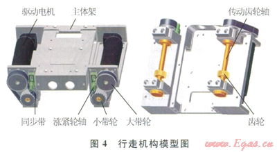 行走機構(gòu)主要由行走驅(qū)動電機、大帶輪、小帶輪、同步帶、漲緊輪軸、主體架、傳動齒輪軸、齒輪等組成(圖4)。
