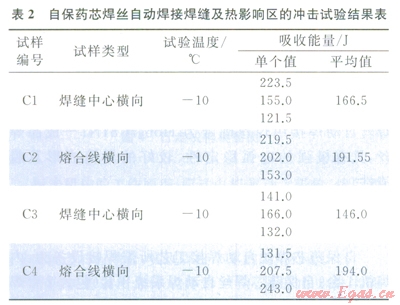 試驗證明,白保藥芯焊絲自動焊接過程平穩(wěn),焊縫成形好,焊接接頭的抗拉強度、側(cè)彎性能、硬度值、沖擊功等力學(xué)性能均滿足X80管線鋼的焊接標(biāo)準(zhǔn)要求。其焊縫及熱影響區(qū)的沖擊試驗結(jié)果見表2。同時,自保藥芯焊絲自動焊接可進(jìn)一步降低焊工的勞動強度,有效規(guī)避焊接施工中氣體供給帶來的不便,可降低管道焊接綜合成本。