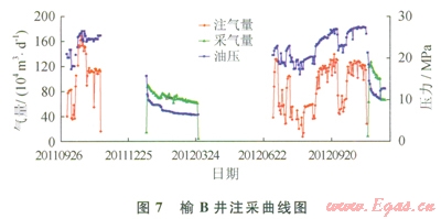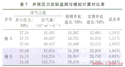 榆林南注采試驗井榆A和榆B井注氣過程中,井筒壓力損失分析見表7所示,計算壓力損失與實測的誤差小于2%。現(xiàn)場試驗表明,室內(nèi)節(jié)點分析軟件模擬計算結(jié)果符合氣井實際運行工況。