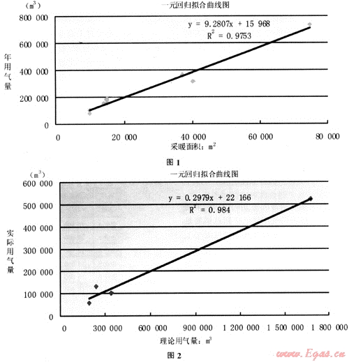 進(jìn)行燃?xì)饪蛻舨膳娣e與年采暖用氣量的相關(guān)性分析,相關(guān)系數(shù)r=0.988,屬高度相關(guān)。根據(jù)一元回歸方程的計(jì)算方法,計(jì)算得出一元線性回歸方程為y=15967.65+9.28x,回歸曲線及樣本點(diǎn)如圖1所示。