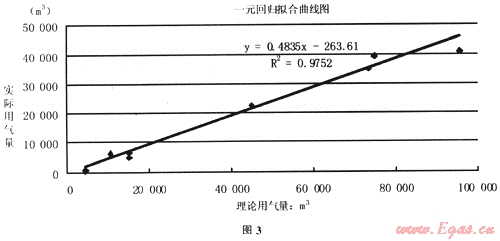 理論用氣量與實(shí)際用氣量的相關(guān)系數(shù)r=0.988,線性關(guān)系顯著。一元回歸方程為y=0.4835x-263.61,擬合度曲線如圖3。