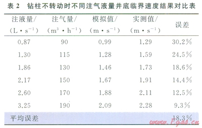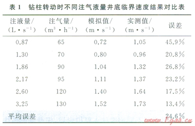臨界流速是指巖屑發(fā)生躍移時(shí)的最低混合物流速。在達(dá)到臨界攜巖的狀態(tài)下,實(shí)測(cè)了氣液兩相混合真實(shí)攜巖臨界速度,再與多相流數(shù)值模擬軟件計(jì)算出的臨界混合速度對(duì)比,得出兩者的誤差。表l、2為鉆柱轉(zhuǎn)動(dòng)和鉆柱不轉(zhuǎn)動(dòng)時(shí)的結(jié)果對(duì)比。