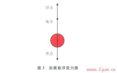 跳起的巖屑當(dāng)落到下井壁時(shí)對(duì)巖屑床的巖屑有沖擊作用,作用力的大小則與其躍起的高度和鉆井液流速有關(guān)。若巖屑躍起較低,則其從液流中取得的動(dòng)量不大,在落回巖屑床后不會(huì)繼續(xù)跳動(dòng)。若躍起較高,則落到巖屑床后還可以重新跳起。躍起高度與鉆井液密度成反比,這就是在水平井中巖屑運(yùn)移的最為特殊的一類運(yùn)動(dòng)方式——躍移,巖屑躍移受力圖如圖7所示。