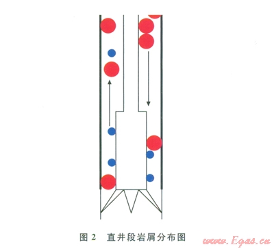 由于管流運(yùn)動(dòng)與巖屑顆粒重力的方向性差異,直井段與水平井段巖屑運(yùn)移規(guī)律大為不同(圖1、2)。由圖l可以看出:在鉆頭破巖后大顆粒尺寸巖屑在鉆鋌處由于流速高可以較為順暢地運(yùn)移;到了鉆鋌與鉆桿交界處由于環(huán)空面積陡然增加,大顆粒巖屑可能發(fā)生堆積。對(duì)比直井段與水平井段,直井段中較大巖屑會(huì)回落至井底重復(fù)破碎;而水平井段一旦產(chǎn)生流體所不能攜帶的大顆粒巖屑,這些巖屑只會(huì)停留在下井壁等待鉆具的碾壓直至形成小顆粒才被流體順利攜走。