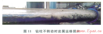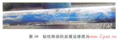 圖10、11分別為鉆柱轉(zhuǎn)動(dòng)、鉆柱不轉(zhuǎn)動(dòng)時(shí)的巖屑運(yùn)移實(shí)驗(yàn)現(xiàn)象。