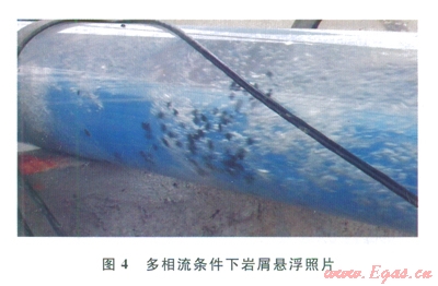 懸浮是巖屑顆粒運(yùn)動(dòng)的重要方式,引起巖屑顆粒懸浮的主要因素是紊動(dòng)作用(圖3)。懸浮運(yùn)動(dòng)的形式是隨鉆井液漂流,懸浮運(yùn)動(dòng)時(shí)受到2種力的作用:①重力,使巖屑顆粒向下井壁沉降;②氣液兩相流推動(dòng)力,使巖屑顆粒沿井筒向下游運(yùn)動(dòng)。巖屑顆粒向下游運(yùn)動(dòng)的速度與氣液兩相流速度有關(guān),巖屑顆粒輸送量可間接代表巖屑顆粒向下游運(yùn)動(dòng)的速度,流量越大,可帶走的巖屑顆粒量也越多。懸浮顆粒在沉降過程中被渦流帶回上層,使巖屑顆粒上下漂移,沉降速度變慢,巖屑懸浮照片如圖4所示。