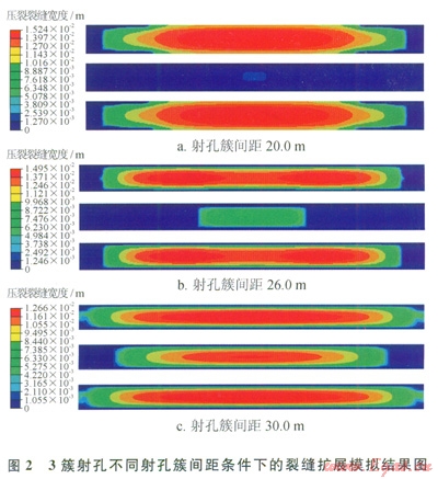 筆者模擬了2簇、3簇和4簇射孔在不同的射孔簇間距條件下的裂縫擴(kuò)展,圖2所示為3簇射孔、不同的射孔簇間距條件下的擴(kuò)展結(jié)果,圖2-a為射孔簇間距為20.0m時的裂縫擴(kuò)展結(jié)果,中間的射孔簇只能開啟小段距離后就發(fā)生止裂,不能形成有效裂縫;圖2-b所示的為射孔簇間距為26.0m時的裂縫寬度圖,中間的射孔簇產(chǎn)生的壓裂裂縫能擴(kuò)展一段距離,但是裂縫的艮度有限,不到兩端射孔壓裂裂縫的一半;圖2-c所示的是射孔簇間距為30.0m時的裂縫擴(kuò)展結(jié)果,中間的裂縫長度只比兩端的裂縫略短,形成了有效裂縫。