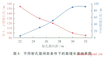 根據(jù)改造儲層的物性參數(shù)以及相鄰水平井的壓裂施工參數(shù),對要優(yōu)化的水平井進(jìn)行了“分段多簇”壓裂裂縫擴(kuò)展模擬,不同射孔簇間距條件下得到的壓裂裂縫長度如圖6所示(考慮對稱性,兩端射孔簇的裂縫在圖中只畫一條曲線):當(dāng)射孔間距為22.0m時,中間射孔簇的壓裂裂縫基本沒有壓開,只形成了很短的壓裂裂縫。當(dāng)射孔簇間距為30.0m時,中間的射孔簇形成的壓裂裂縫和兩端射孔簇形成的壓裂裂縫基本相當(dāng)。因此,壓裂設(shè)計過程中,射孔簇的間距設(shè)定在30.0m左右比較合適,根據(jù)射孔簇間距參數(shù),每個壓裂段的長度確定為90.0m,壓裂段數(shù)為ll段。
