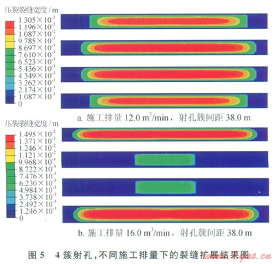 5所示的是4簇射孔、射孔簇間距為38.0m,施工排量分別為l2.0m3rainl6.0m3min時的裂縫擴(kuò)展情況,施工排量增大4.0m3min,中間裂縫的長度發(fā)生了明顯變化;施工排量為l6.0m3min、4簇射孔條件下,中間射孔簇?zé)o法形成有效裂縫。