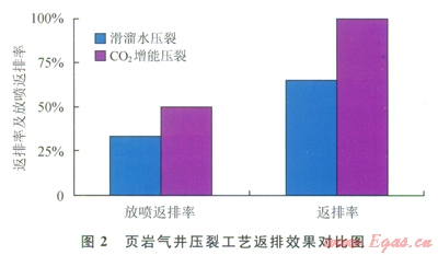 從圖2可以看出,采用CO2增能壓裂后,頁巖氣井的壓裂液放噴返排率提高了17%、最終返排率提高35%,同時排液周期從之前的平均45d縮短到25d左右,效果非常明顯。