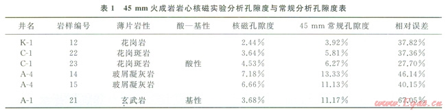 6塊巖心核磁實(shí)驗(yàn)孔隙度與常規(guī)分析孔隙度對(duì)比看出,火成巖核磁實(shí)驗(yàn)孔隙度明顯低于常規(guī)分析的孔隙度(表1),并且基性巖(21號(hào)巖樣)減小的程度要明顯的大于酸性巖(如表l中的12、22、23號(hào)巖樣)。這是因?yàn)?,基性玄武巖的磁化率高,孔隙內(nèi)部梯度磁場(chǎng)強(qiáng),核磁信號(hào)衰減幅度大。