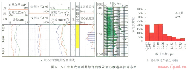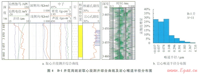 從孔喉大小看,圖5所示的基性玄武巖的孔喉半徑(圖5-b)要明顯的大于酸性花崗斑巖(圖4-b)。基性玄武巖孔喉半徑大于0.148mm的孔喉體積要明顯的大于酸性花崗斑巖,孔喉半徑大于0.148mm的孔喉體積兩口井分別是48%和l8.2%,孔喉半徑大小差異明顯。