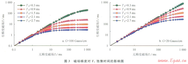 對(duì)比模擬的兩種大小的內(nèi)部梯度磁場(chǎng)對(duì)T2譜影響的成果圖可看出(圖3):相同回波間隔下,內(nèi)部磁場(chǎng)梯度越強(qiáng),相同弛豫組分對(duì)應(yīng)的T2譜時(shí)間越短,意味著T2譜前移越明顯,使其向弛豫時(shí)間變短的方向移動(dòng)。