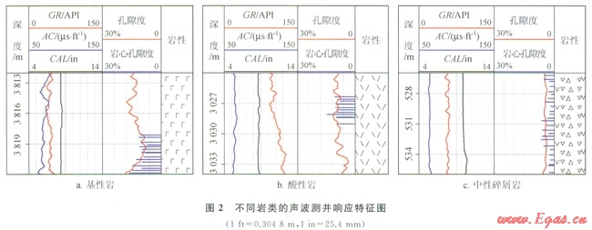 聲波測(cè)井能有效反映孔隙均勻分布的均質(zhì)地層的孔隙度,而火成巖儲(chǔ)層孔隙孔徑差別較大,孔隙分布不均勻,孔隙分布各向異性強(qiáng),連通性差(圖1)。如準(zhǔn)噶爾盆地陸東地區(qū)和克拉美麗氣田的火成巖儲(chǔ)層孔隙分布不均勻,如黃驊坳陷北堡地區(qū)火成巖儲(chǔ)層中普遍發(fā)育有連通性較差的氣孔和杏仁體內(nèi)孔[7],松遼盆地慶深氣田儲(chǔ)層中發(fā)育有孔喉比大、孔喉分選差的儲(chǔ)層,可見(jiàn)火成巖儲(chǔ)層的孔隙分布往往不均勻[8]。聲波測(cè)井記錄的是聲波傳播最快的首波,對(duì)于這種孔隙分布不均勻的儲(chǔ)層,聲波測(cè)井記錄的是繞過(guò)部分孔隙傳播速度最快的波,因?yàn)檠毓羌軅鞑サ穆暡ㄋ俣茸羁?,故聲波測(cè)井在這類(lèi)儲(chǔ)層中測(cè)得的速度往往偏低;此外,實(shí)測(cè)資料也顯示,從酸性巖到基性巖類(lèi),隨著鐵鎂礦物含量的增加,密度測(cè)井值和補(bǔ)償中子值是逐漸增大,且不同巖類(lèi)間差別大,但聲波總體變化不大,差別較小。圖2是某地區(qū)基性熔巖、酸性熔巖和中性火山角礫巖的聲波時(shí)差對(duì)比圖,3種不同的巖性且孔隙度存在一定差異,但3種巖性的聲波時(shí)差差別較小。準(zhǔn)噶爾盆地l97口井不同巖性的火成巖聲波時(shí)差統(tǒng)計(jì)也顯示,不同巖性火成巖的聲波時(shí)差無(wú)明顯的差異。大慶油田深層不同火山熔巖的聲波測(cè)井值也無(wú)明顯的差別。因此,不宜優(yōu)選聲波測(cè)井資料來(lái)計(jì)算火成巖地層的孔隙度。