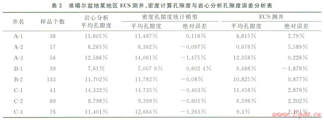 密度測(cè)井反映的是儀器探測(cè)范圍內(nèi)地層的總密度,能有效反映地層的總孔隙度,對(duì)各種類(lèi)型的孔隙度都能有效反映,如火成巖地層中大的氣孔、溶蝕孔洞空隙都能反映。采用巖心刻度測(cè)井的方法,分區(qū)塊、分巖性建立了不同區(qū)塊、不同巖性的密度測(cè)井與巖心分析孔隙度間的線(xiàn)性回歸模型用于計(jì)算火成巖儲(chǔ)層的孔隙度,實(shí)際應(yīng)用表明,利用密度曲線(xiàn)計(jì)算的孔隙度與巖心分析孔隙度之間的誤差較小(表2)。