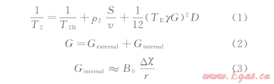 式中T2B為體積弛豫,ms;D為擴(kuò)散系數(shù),cm2/s;G為觀測(cè)時(shí)的梯度磁場(chǎng);g為旋磁比;TE為回波間隔;r2為橫向表面弛豫強(qiáng)度;S/V為巖石比表面;B0為外加磁場(chǎng)強(qiáng)度;r為磁場(chǎng)變化的距離;Dc為巖石骨架顆粒與孔隙流體之間磁化率的差。