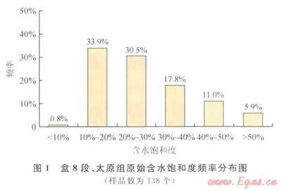 儲層原始含水飽和度由密閉取心井確定。通過統(tǒng)計、分析盆地東部3口密閉取心井盒8段、太原組的138個原始含水飽和度數(shù)據(jù),結(jié)果表明,盒8段、太原組的原始含水飽和度主要分布在40%以下,累計頻率町達83.1%,平均含水飽和度為26.7%(圖1)。具有較低的原始含水飽和度特征。