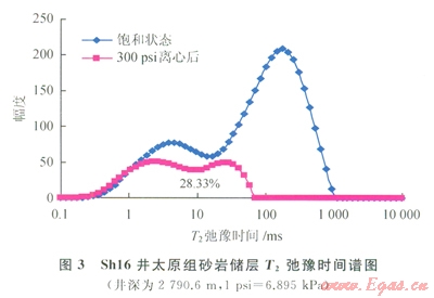 核磁共振呵動流體實驗原理是通過對儲層孔隙流體中氫核信號的觀測,可以贏接測量巖石中流體特性。并能獲得儲層有效孔隙度、自由流體和束縛流體體積、孔隙結(jié)構(gòu)等地質(zhì)信息[8-12]。巖心樣品飽和流體后置于均勻分布的靜磁場中,流體中的氫核(1H)會被磁場極化,產(chǎn)生磁化矢量,此時對樣品施加一定頻率的射頻場,就會產(chǎn)生核磁共振;撤掉射頻場就會接收到氫核在孔隙中做弛豫運動幅度隨時間以指數(shù)函數(shù)衰減的信號。核磁共振信號衰減的快慢采用橫向弛豫時間T2來描述,飽和流體的巖樣進行核磁共振T2測試時,T2弛豫時間的大小取決于流體分子受孔隙固體表面作用力的強弱,因此利用核磁共振了T2譜可對巖樣孔隙內(nèi)流體的賦存狀態(tài)進行分析,能夠定量測試出可動流體飽和度及束縛流體飽和度。圖3為Shl6井太原組砂巖儲層核磁共振實驗的T2弛豫時間譜圖,可以確定,該砂巖儲層的束縛水飽和度為28.33%。