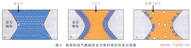 致密砂巖超低含水飽和度的形成過程如圖6所示,圖6-a為儲層早成巖期的機械壓實階段,此時干酪根未成熟,儲層孔喉中100%飽含地層水;圖6-b為儲層的可動水排出階段,此時隨著干酪根成熟度的增加,生成的天然氣注入儲集層,驅(qū)替儲層的可動水,儲層的含水飽和度接近于儲層的束縛水飽和度;圖6-c為束縛水蒸發(fā)氣化階段,此時隨著溫度壓力的增大和干氣的注入,使儲層的束縛水被蒸發(fā)氣化,不斷隨著天然氣的運移攜帶出儲層,從而形成超低含水飽和度氣藏。