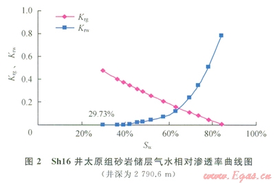 應用氣水相滲和核磁共振2種實驗技術(shù)方法測試束縛水飽和度。氣水相對滲透率曲線在水相滲透率為0處對應的含水飽和度即為束縛水飽和度,圖2為Shl6井太原組砂巖儲層的氣水相對滲透率曲線,可以確定該砂巖儲層的束縛水飽和度為29.73%。