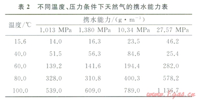 氣藏形成跨越相當長的地質(zhì)時間,地層條件下氣藏中天然氣中的含水量取決于地層的溫度和壓力。在氣藏形成初期,溫度和壓力較低,但隨著埋藏深度增加,溫度壓力升高,天然氣攜水的能力不斷增強(表2),據(jù)Bennion[13]等研究,27.57MPa、100℃時天然氣蒸發(fā)和攜帶水的能力為ll36.7g/m3,而在1.013MPa、15.6℃時的能力僅為14.0g/m3,隨著溫度、壓力的增大,天然氣攜水的能力顯著增加。