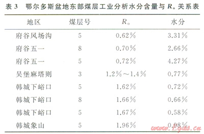 水在煤中的賦存狀態(tài)分為外在水分、內(nèi)在水分以及同煤中礦物質(zhì)結(jié)合的結(jié)晶水。煤層工業(yè)分析水分含量是指煤層中的內(nèi)在水分,內(nèi)在水分是指吸附或凝聚在煤顆粒內(nèi)部毛細孔中的水。通過對鄂爾多斯盆地東部煤層工業(yè)分析水分含量與有機質(zhì)成熟度(R。)關(guān)系時發(fā)現(xiàn)(表3),在R。>1.2%時,煤中水分含量明顯降低,預示著后期烴源巖中生成的天然氣中水蒸氣的含量越少,并處在欠飽和狀態(tài),而該區(qū)上古生界煤系烴源巖演化程度普遍達到高成熟和過成熟階段,在天然氣成藏后期會有更多的干氣注入儲層,導致儲層中的束縛水蒸發(fā)遷移,有利于形成超低含水飽和度氣藏。