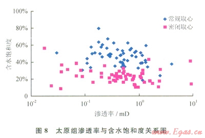 只要進入儲層的水相流體的飽和度超過儲層水相流體的原始飽和度,就會引起儲層水鎖傷害。通過密閉取心含水飽和度與常規(guī)取心含水飽和度對比發(fā)現(xiàn):太原組和盒8段密閉取心含水飽和度一般低于40%(圖7、圖8);在不同滲透率區(qū)間,密閉取心含水飽和度均小于常規(guī)取心含水飽和度,表明鄂爾多斯盆地東部致密儲層普遍存在吸水現(xiàn)象及水基鉆井液的傷害,鉆井過程就已普遍存在著水鎖傷害。