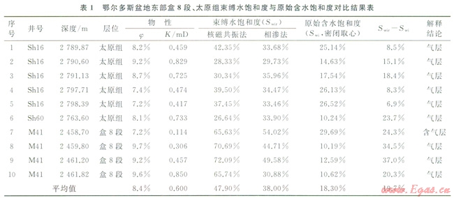 選取鄂爾多斯盆地東部的Shl6、Sh60井和M4l片盒8段、太原組的l0塊密閉取心樣品,開展氣水相滲、核磁共振實驗測試,將密閉取心所測試的儲層原始含水飽和度與采用氣水相滲、核磁共振實驗所確定的束縛水飽和度進行了對比。