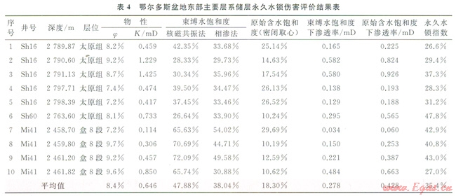 10塊巖心樣品的評價結(jié)果顯示(表4),永久性水鎖滲透率傷害率最小為26.6%,最大為47.8%,平均為35.4%;原始含水飽和度下氣相滲透率是束縛水飽和度下氣相滲透率的l.4~1.9倍,平均為1.6倍。因此設法預防和解除永久性水鎖傷害,恢復原始含水飽和度下的氣相滲透率,對提高相同儲層物性條件的儲層氣相滲透率和提高單井產(chǎn)量有著重要的意義。