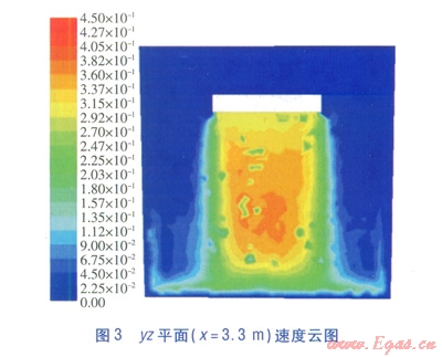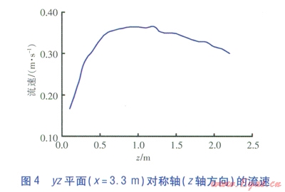 yz平面(x=3.3m)速度云圖見圖3,yz平面(x=3.3m)對稱軸(z軸方向)的流速見圖4。由圖3、4可知,貼附射流的流速沿射程方向呈現(xiàn)先增大后減小的變化趨勢。這種變化是貼附射流在發(fā)展的過程中,受豎向慣性力和豎向浮升力共同作用的結(jié)果。由于送風(fēng)溫度較低,在出口階段氣流密度較大,氣流豎向慣性力作用比豎向浮升力作用明顯,因此對氣流起著加速作用。隨著貼附射流的發(fā)展,氣流溫度升高,豎向浮升力作用加強(qiáng)以及氣流接近地面時(shí)受阻,流速逐漸下降。