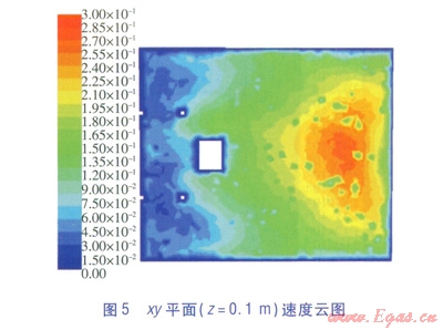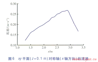 當(dāng)貼附射流接近地面時(shí),逐漸形成沖擊地板面的沖擊射流[7]。xy平面(z=0.1m)速度云圖見圖5,xy平面(z=0.1m)對稱軸(x軸方向)的流速見圖6。