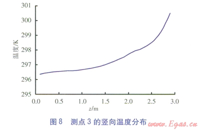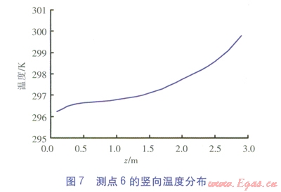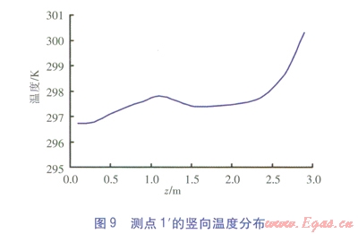 測點(diǎn)6、3、1¢的豎向溫度分布分別見圖7~9。由圖7~9可知,3個測點(diǎn)的溫度沿高度方向(三軸方向)逐漸增大。對于測點(diǎn)6、3,在0.1~1.2m高度范圍內(nèi)溫度緩慢升高,當(dāng)高于1.2m后溫升速度較快。對于測點(diǎn)l¢,在0.1~2.0m高度范圍內(nèi)溫度緩慢升高,在0.2~1.5m高度范圍內(nèi)溫度出現(xiàn)波動,這一高度區(qū)域恰好與坐姿下的人體腳踝到高于頭頂30cm一段吻合。當(dāng)高于2.0m后,溫升速度較快。