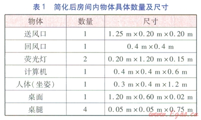 房間的物理模型見圖1,房間的長×寬×高為3.40m×2.90m×2.95m。房間圍護(hù)結(jié)構(gòu)視為絕熱,送風(fēng)裝置安裝于側(cè)墻上部,送風(fēng)口高度為2.2m。回風(fēng)口位置見圖l,尺寸為0.4m×0.4m。模型房間內(nèi)有2盞熒光燈,電功率均為36W。人體、計(jì)算機(jī)等熱源靠近回風(fēng)口一側(cè)的墻邊,人體和計(jì)算機(jī)的發(fā)熱量分別為l00W/人、300W/臺。將房間內(nèi)的人體、計(jì)算機(jī)、桌子等分別簡化成規(guī)格不同的立方體,簡化后房間內(nèi)物體具體數(shù)量及尺寸見表1。