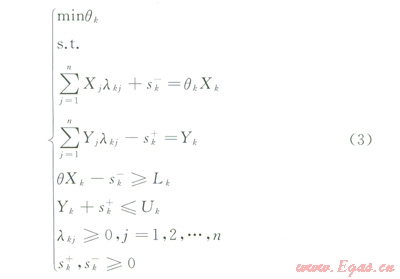 通過式(3)求解,可以得到在有邊界約束條件下第k個(gè)決策單元的綜合效率評(píng)價(jià)指數(shù)(即相對(duì)有效性值)qk以及參數(shù)lk和各松弛變量s`k,sk+的最優(yōu)解qk*、lk*、s`k*、sk+*。