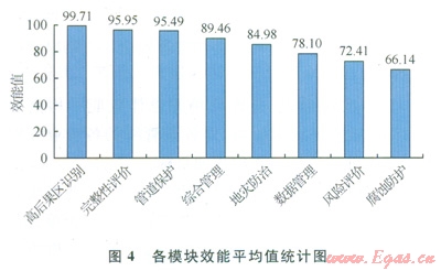 本次評(píng)價(jià)針對(duì)各模塊都進(jìn)行了評(píng)價(jià),統(tǒng)計(jì)結(jié)果見表4。對(duì)7條線路管道完整性管理總體效能評(píng)價(jià)的結(jié)果見圖3。7條線路各業(yè)務(wù)模塊效能平均值統(tǒng)計(jì)如圖4所示。