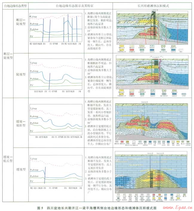 為建立不同臺緣帶長興組礁灘體沉積模式,科學(xué)指導(dǎo)礁灘體儲層預(yù)測,筆者利用前緣斜坡角變化、礁灘體地震反射特征、坡折帶發(fā)育程度以及長興組厚度變化等成果,根據(jù)礁灘體發(fā)育的主控因素,將開江梁平海槽兩側(cè)臺地邊緣形態(tài)劃分為斷控陡坡型和緩坡型2大類,包含斷層一陡坡型臺地邊緣、陡坡型臺地邊緣和緩坡—坡折型臺地邊緣、緩坡型臺地邊緣4種類型,每種類型的主要特征如圖5所述??傊?,長興期開江梁平海槽兩側(cè)臺地邊緣形態(tài)整體表現(xiàn)為箕形,具體特征是:海槽向NW方向敞開且逐漸加深,向SE方向變淺變緩且收口;海槽北段和中段局部地區(qū)臺地兩側(cè)的外形輪廓基本對稱,明顯受基底斷裂控制,臺緣帶呈山脊?fàn)钋彝蛊痫@著,發(fā)育明顯坡折帶;海槽南段兩側(cè)臺地邊緣的外形輪廓呈現(xiàn)西陡南緩的不對稱箕形,基底斷裂不發(fā)育,臺緣帶呈寬緩低丘,坡折帶不明顯。