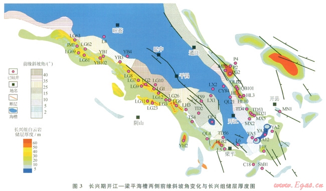 圖3是利用以上方法得到的開江 梁平海槽兩側(cè)臺地前緣斜坡角大小的粗略圖。該圖顯示,開江梁平海槽兩側(cè)前緣斜坡角度變化自北向南呈現(xiàn)不均一變化,海槽北部和中部臺地前緣斜坡角度相對較大,一般大于l0°,最大可達(dá)60°,海槽兩側(cè)臺地邊緣帶凸起明顯,發(fā)育明顯坡折帶;海槽南部前緣斜坡角度普遍較小,多數(shù)小于l0°,整體表現(xiàn)為西陡南緩的大型箕狀寬緩斜坡。