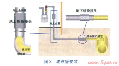 波紋管安裝方法簡(jiǎn)單(見圖2),先在庭院靠近樓房的位置開挖一小坑,外露埋地的引入鍍鋅鋼管,將鍍鋅鋼管隔離。然后在地上引入管距地面約lm處拆開接口或引入管閥門,利用專用工具設(shè)備及按照廠家提供的操作指引,將波紋管從地上引入管開口一端推進(jìn)鍍鋅鋼管內(nèi),直至波紋管從鍍鋅鋼管另一端埋地開口導(dǎo)出。再利用特制的轉(zhuǎn)換接頭把兩端凸出的波紋管分別連接至地上金屬管和埋地聚乙烯管道,隨即進(jìn)行壓力試驗(yàn)。最后,向轉(zhuǎn)換接頭上附設(shè)的灌漿孔中注入水泥漿,填充波紋管與鍍鋅鋼管內(nèi)壁之間的空隙,至此修復(fù)工作完成。內(nèi)襯的波紋管受原來(lái)的鍍鋅鋼管保護(hù),在一定程度上可降低外力影響。室內(nèi)安裝方法與此類似。