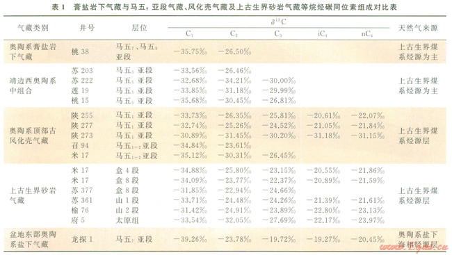 靖邊氣田西北側(cè)已有1口探井(桃38井),奧陶系馬家溝組馬五段地層保存齊全,在鉆穿馬五6亞段膏鹽巖層后,于馬五7、馬五9亞段白云巖中見(jiàn)到較好的含氣顯示(氣層距奧陶系頂面風(fēng)化殼超過(guò)200m),后經(jīng)酸化改造、試氣獲得l2.91×104m3/d的較高產(chǎn)工業(yè)氣流,成為盆地內(nèi)首次在膏鹽巖下深層獲得工業(yè)氣流的探井,產(chǎn)層天然氣樣品的甲烷碳同位素值為-35.75‰,乙烷碳同位素值為-26.50‰,與盆地本部來(lái)源于上古生界煤系烴源巖的奧陶系頂部風(fēng)化殼氣藏、上古生界砂巖氣藏、奧陶系中組合馬五5亞段氣藏等的天然氣烷烴碳同位素組成基本一致(表1)。這類煤系烴源氣藏的甲烷碳同位素值一般在-30‰~-36‰之間,乙烷碳同位素值為-23‰~-30‰之間[18-22],證實(shí)了膏鹽巖下圈閉的有效性及氣源主要來(lái)自上古生界煤系烴源巖的基本成藏特征。另外,近期通過(guò)靖邊氣田勘探早期鉆入膏鹽巖下深層的探井復(fù)查分析,也發(fā)現(xiàn)l0余口探井在膏鹽巖下有一定的含氣顯示,但由于當(dāng)初勘探重點(diǎn)是奧陶系頂部的馬五1+2亞段風(fēng)化殼氣藏,對(duì)馬五5亞段及以下的中下組合含氣層系認(rèn)識(shí)不足,加之個(gè)別井試氣效果不理想,也就沒(méi)有進(jìn)一步深入勘探之。