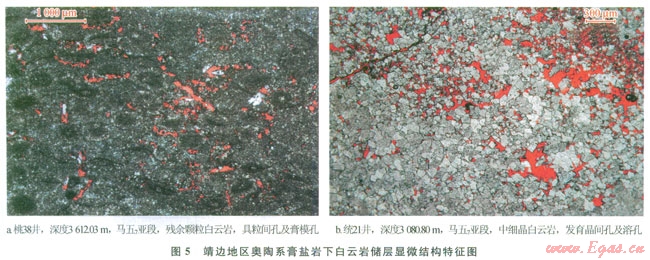 層序旋回與沉積微相的系統(tǒng)分析表明,馬五9亞段、馬五5亞段與馬五;亞段類似,同為夾在蒸發(fā)巖層序中的短期海侵旋回沉積,其相帶展布均有近南北向半環(huán)帶狀展布特征,以馬五,亞段為例,由東向西依次為東部洼地、橫山緩坡、靖西臺(tái)坪的巖相展布格局(圖4)。其中靖西臺(tái)坪區(qū)由于水體能量相對(duì)較高,沉積期多發(fā)育顆粒灘相沉積,淺埋藏期白云巖化后容易形成孔隙性較好的白云巖儲(chǔ)層(圖5)。向東進(jìn)入橫山緩坡相帶則形成結(jié)構(gòu)較為致密,且白云巖化程度也明顯減弱,巖性主要為含灰或含膏質(zhì)的白云巖,整體構(gòu)成了靖西臺(tái)坪相帶的致密巖性相變帶,為區(qū)域巖性圈閉帶的形成奠定了基礎(chǔ)。
