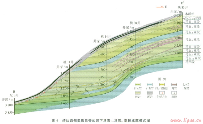 前已述及,馬五6膏鹽巖下發(fā)育馬五7、馬五9亞段及馬四段等多個(gè)儲(chǔ)集層段,其間又為馬五8、馬五10亞段等蒸發(fā)巖組合分隔,各自都具有相似的成藏地質(zhì)背景,因而都具有一定的成藏潛力。其次,即使在馬五8、馬五10亞段乃至馬五6亞段等蒸發(fā)巖層段中也常夾有一定儲(chǔ)集性的白云巖夾層,它們雖在橫向上規(guī)模相對(duì)較小,但在局部也可能形成有效的工業(yè)性聚集,對(duì)于膏鹽巖下的勘探也有一定的實(shí)際意義。