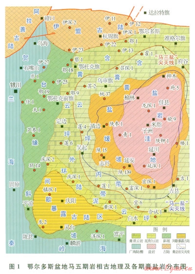 鄂爾多斯盆地奧陶系馬家溝組發(fā)育巨厚的膏鹽巖沉積地層,按照沉積旋回劃分,其主要分布在下奧陶統(tǒng)馬家溝組馬一、馬三、馬五段3個(gè)海退期沉積層序中[1-3]。其中馬五段是馬家溝組最后一期蒸發(fā)旋回形成的沉積地層,內(nèi)部又可進(jìn)一步細(xì)分為馬五10、馬五8、馬五6、馬五4亞段等4個(gè)主要的膏鹽巖層段,尤以馬五6亞段的膏鹽巖分布范圍為最廣,面積約5×l04km2,主要分布在盆地中東部的陜北米脂鹽洼沉積相區(qū)(圖1)。因而,通常所言?shī)W陶系鹽上和鹽下地層均以馬五8亞段為界劃分。