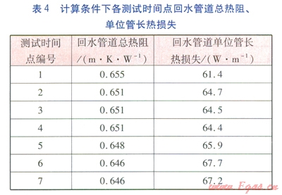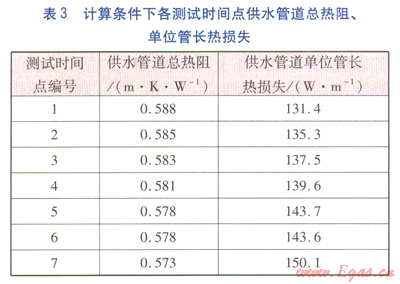計(jì)算條件(指保溫層、保護(hù)層材料熱導(dǎo)率均取計(jì)算值時(shí))下各測(cè)試時(shí)間點(diǎn)供回水管道總熱阻、單位管長熱損失分別見表3、4。