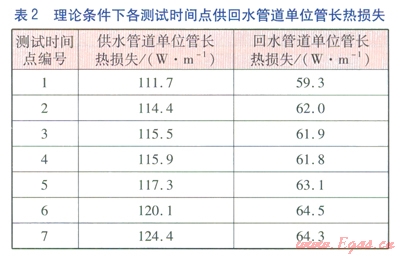 由已知數(shù)據(jù)可計(jì)算得附加熱阻為0.043m·K/W,將Ri+RPE+Rsoi定義為總熱阻。當(dāng)保溫層材料熱導(dǎo)率取理論值(0.0275W·m-1·K-1),保護(hù)層材料熱導(dǎo)率取理論值(0.041W·m-1·K-1)時(shí),總熱阻計(jì)算結(jié)果為0.693m·K/w。理論條件(指保溫層、保護(hù)層材料熱導(dǎo)率均取理論值時(shí))下各測(cè)試時(shí)間點(diǎn)供回水管道單位管長熱損失見表2。