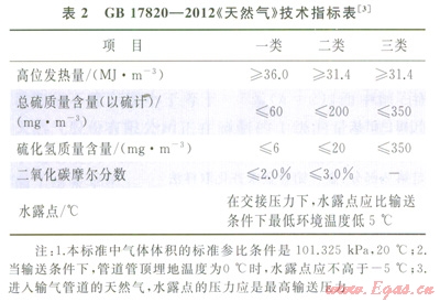 GB l7820規(guī)定了經(jīng)過處理并通過管道輸送的商品天然氣分類和技術(shù)要求[3],為天然氣工業(yè)的發(fā)展制定了一個統(tǒng)一的產(chǎn)品要求(表2)。其中發(fā)熱量、總硫含量、硫化氫含量、二氧化碳含量和水露點5項關(guān)鍵控制性技術(shù)指標(biāo)體現(xiàn)安全衛(wèi)生、環(huán)保和經(jīng)濟效益要求,而一類氣指標(biāo)與歐、美、俄處于同等水平,實現(xiàn)與國際接軌,保障了進(jìn)口天然氣質(zhì)量,為天然氣質(zhì)量控制提供了依據(jù)。