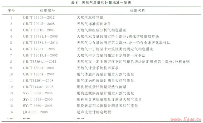 為配合GB l7820《天然氣》和GB/T l8603《天然氣計量系統(tǒng)技術(shù)要求》的實施,先后制定了天然氣取樣、組成分析、物性計算、能量測定、流量檢測等50余項國家和行業(yè)標(biāo)準(zhǔn)(表5),初步構(gòu)建了以GB l7820《天然氣》和GB/T l8603《天然氣計量系統(tǒng)技術(shù)要求》為核心的質(zhì)量和計量技術(shù)標(biāo)準(zhǔn)體系,整體達(dá)到國際先進(jìn)水平。