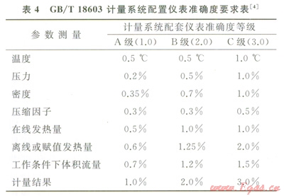 參考0IML Rl40和ENl776,GB/T l8603規(guī)定了新建和改擴建的天然氣計量站貿(mào)易計量系統(tǒng)的設(shè)計、配置、建設(shè)、投產(chǎn)運行、維護方面的技術(shù)要求[4](表3),同時給出了計量系統(tǒng)儀表的準(zhǔn)確度要求(表4)。成為計量站建設(shè)和運行維護的依據(jù)。