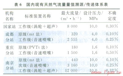 20世紀(jì)80年代,我國開始在四川成都建設(shè)天然氣流量標(biāo)準(zhǔn)裝置。l996年通過自主研發(fā),建成質(zhì)量時間法原級標(biāo)準(zhǔn)裝置,達(dá)到“90年代中期國際同類裝置的先進(jìn)水平”(亞洲一流)。目前,已建立0.1%的原級標(biāo)準(zhǔn)及配套的傳遞標(biāo)準(zhǔn)和工作標(biāo)準(zhǔn)裝置,形成了完整的量傳溯源體系(表6)。